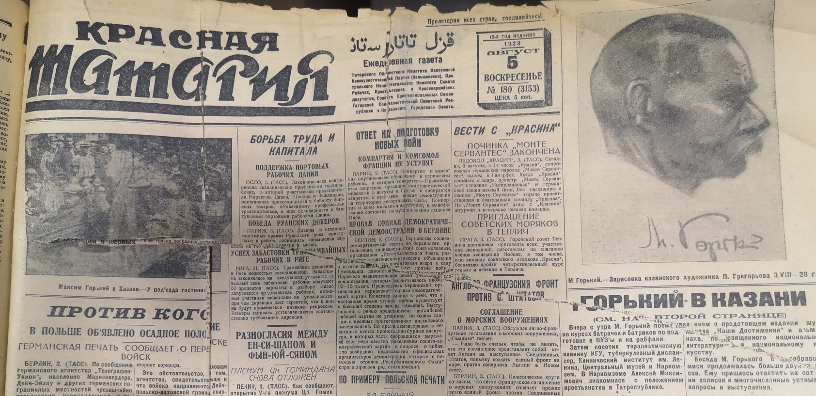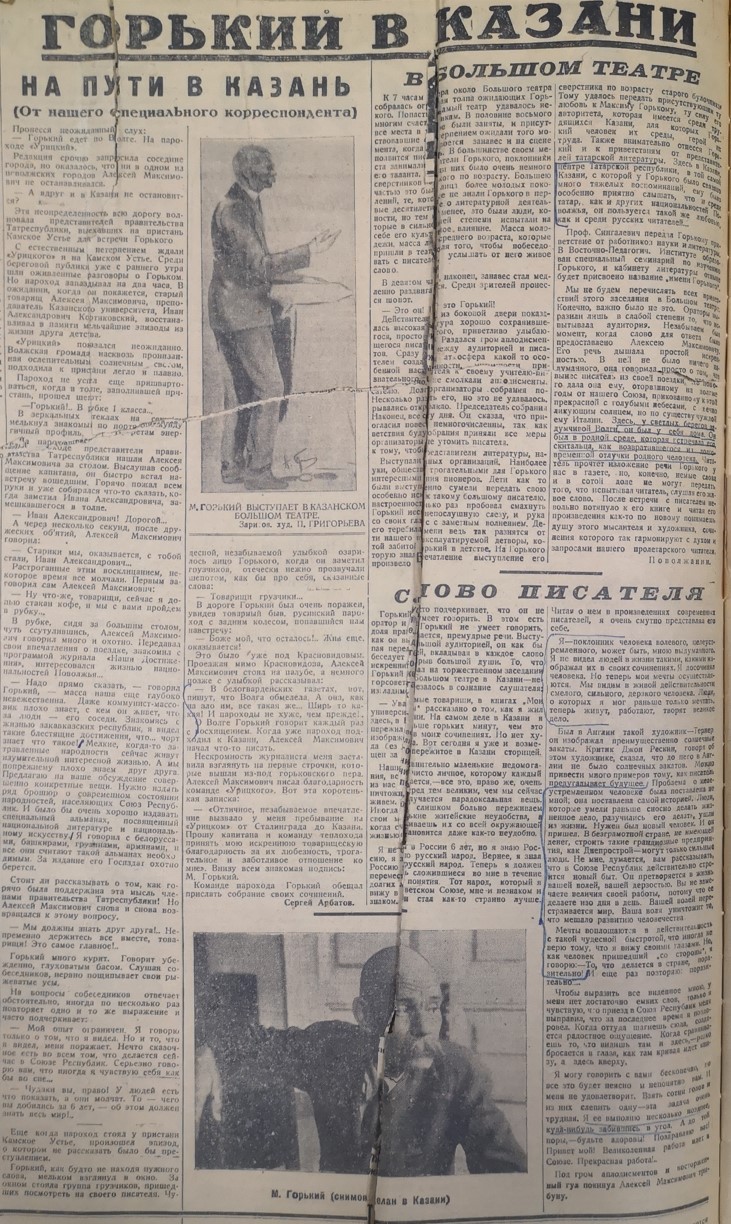 Широко освещался в нашей газете юбилей главного пролетарского писателя Максима Горького – в 1928 году исполнилось 35 лет его литературной деятельности и 60 лет со дня рождения. В многочисленных журналистских заметках вспомнили и о горьковских местах в Казани, и о попытке его самоубийства на берегу реки Казанки…