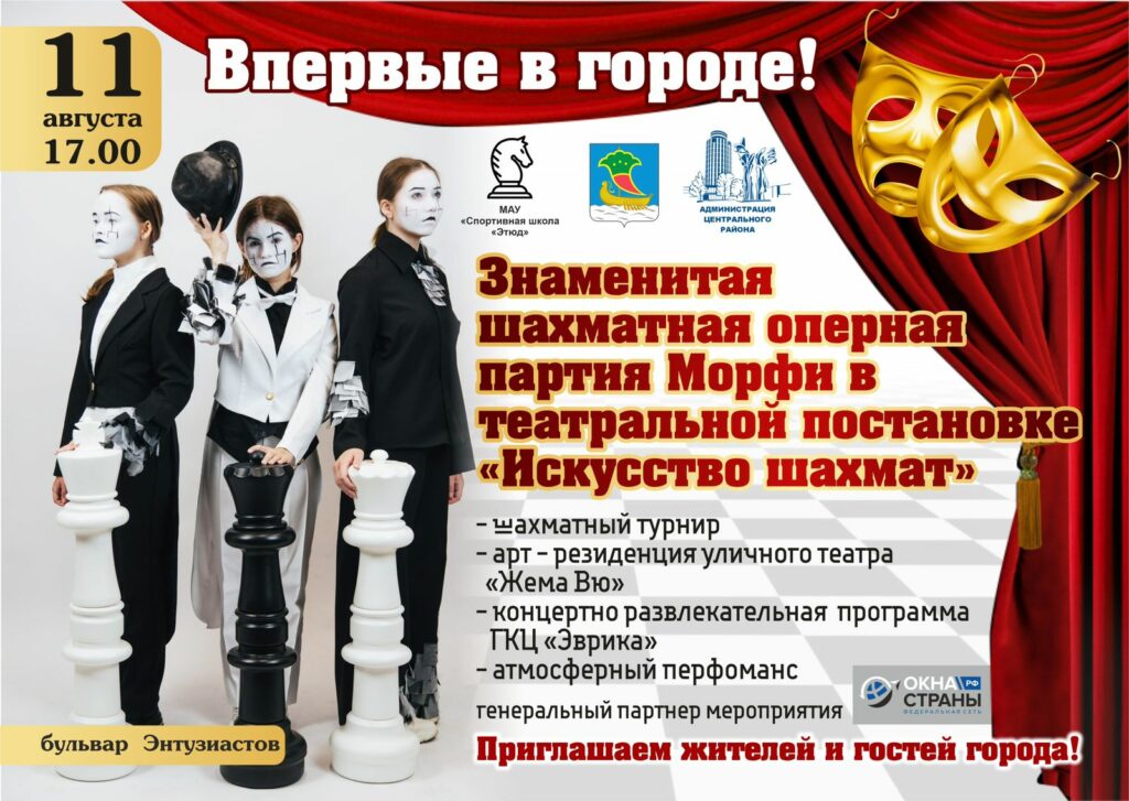 11 августа, в Набережных Челнах в рамках празднования Дня города на бульваре Энтузиастов состоится Шахматный праздник. Знаменитая шахматная оперная партия Морфи в театральной постановке «Искусство шахмат» начнется в 17 часов, сообщает сайт города.