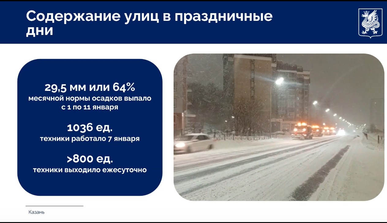 «Начало 2026 года выдалось снежным для Казани. С 1 по 11 января в городе выпало 29,5 мм [осадков], или 64% месячной нормы», – отметил Куляжев. По словам спикера, в новогодние каникулы ежесуточно убирать улицы столицы Татарстана выходило более 800 единиц техники, наибольшее количество – 1036 – вышло на уборку 7 января.