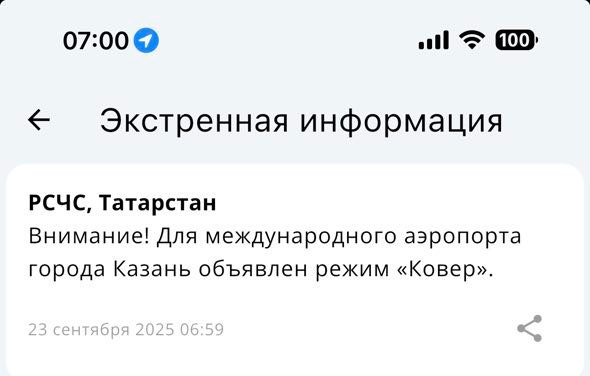 UPD (7:02): В 6:59 МЧС России предупредило, что для аэропорта Казани введен план «Ковер».