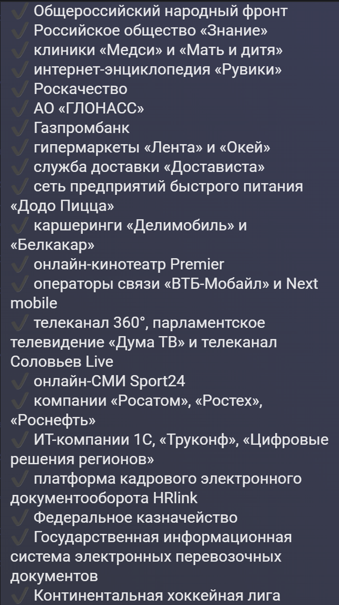 Так, в список сервисов и сайтов, доступных при ограничениях мобильного интернета, были включены платформа поисково-спасательного отряда «ЛизаАлерт» и волонтерская организация «Добро.рф», интернет-энциклопедия «РУВИКИ», службы доставки, сайты клиник, Российского общества «Знание», телеканалов, операторов связи, предприятий быстрого питания, торговых сетей, банков, госструктур и другие.
