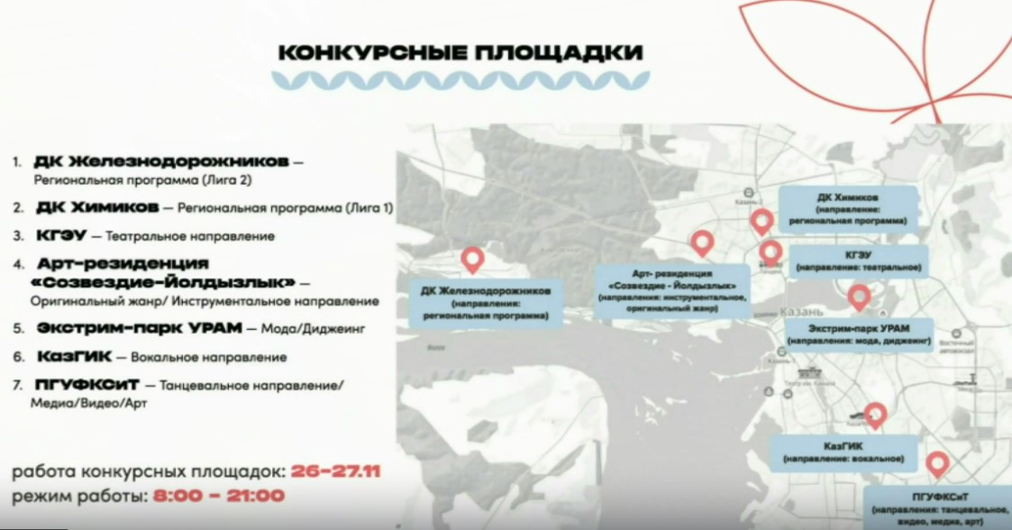 «Церемонии открытия и закрытия фестиваля пройдут в Баскет-холе, а конкурсы пройдут на семи площадках», - отметил Кадыров. По его словам, столица Татарстана в четвертый раз примет «Студвесну» за все время проведения молодежного конкурса. Это доказывает, что Казань умеет и может хорошо принимать масштабные мероприятия.