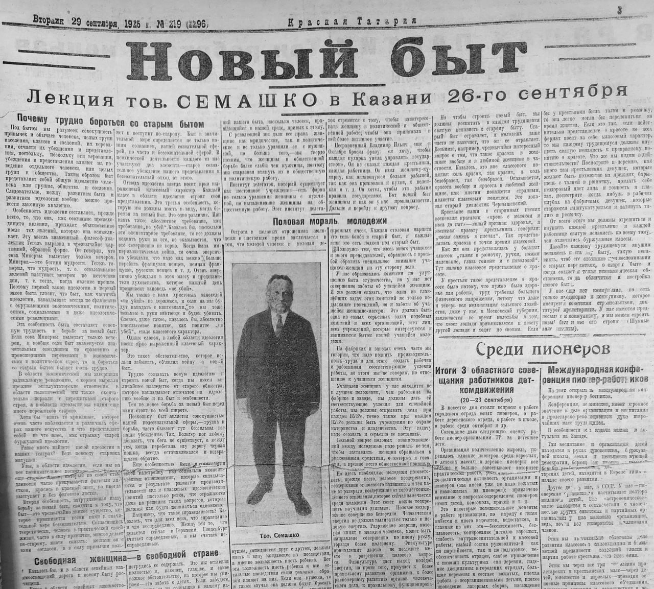 Широко освещался в нашей газете визит в Казань врача, народного комиссара здравоохранения в правительстве РСФСР Николая Семашко. Под его руководством была создана национальная система здравоохранения, получившая его имя. Она обеспечивала бесплатными медицинскими услугами всех граждан. Большая работа шла по пропаганде социальной гигиены и профилактике заболеваний (санминимум).
