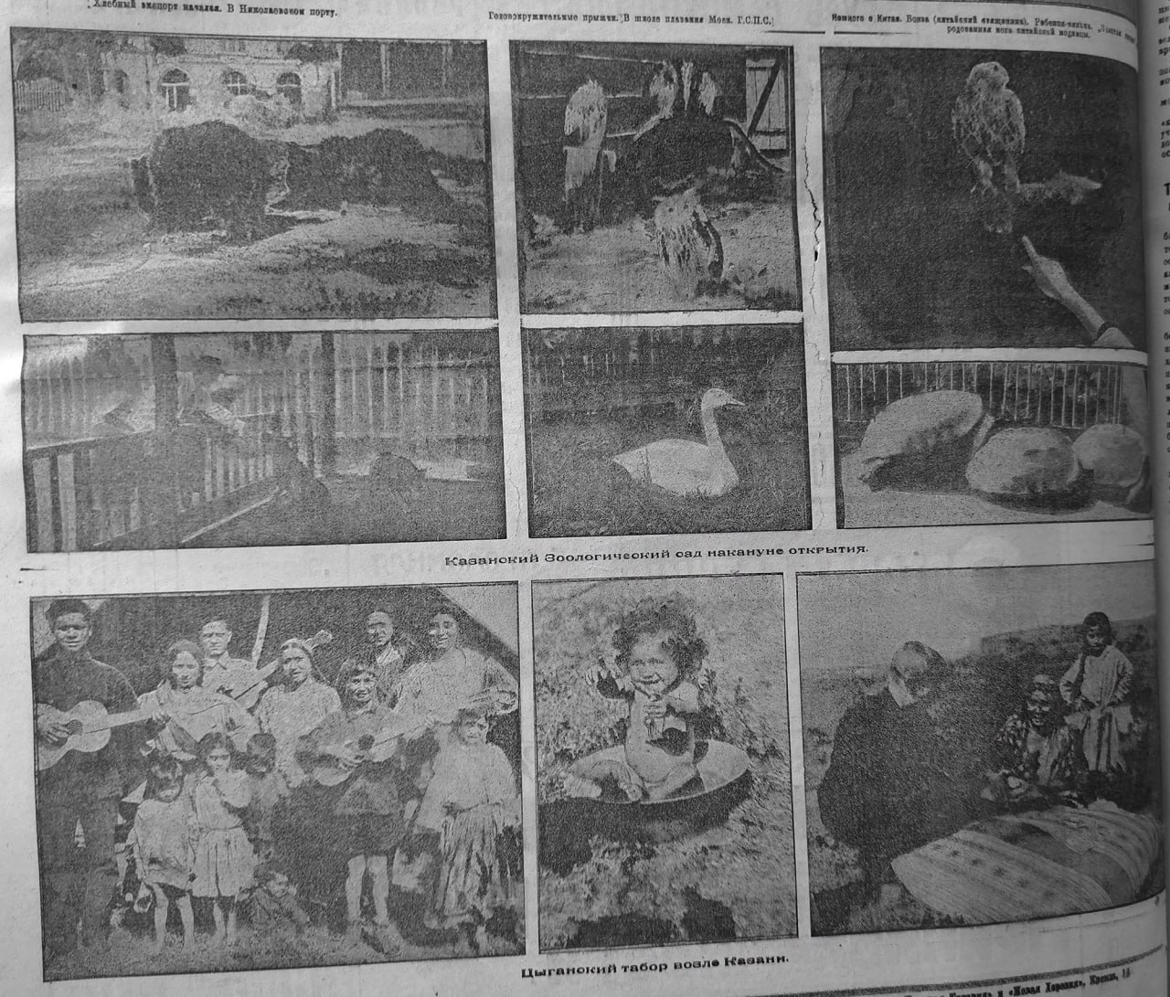Около Казани в 1925 году стоял цыганский табор, и фотокорреспонденты «Красной Татарии» его посещали – на странице газеты выходили отдельные снимки и целые фоторепортажи о быте цыган. На одной из фотографий маленькая кудрявая девочка сидит в тазу (ее, видимо, мыли), улыбается и показывает пальцем в нашего фотографа. На другом снимке смешанный хор готовится исполнить цыганскую песню. У двух мужчин и одного подростка в руках гитары.