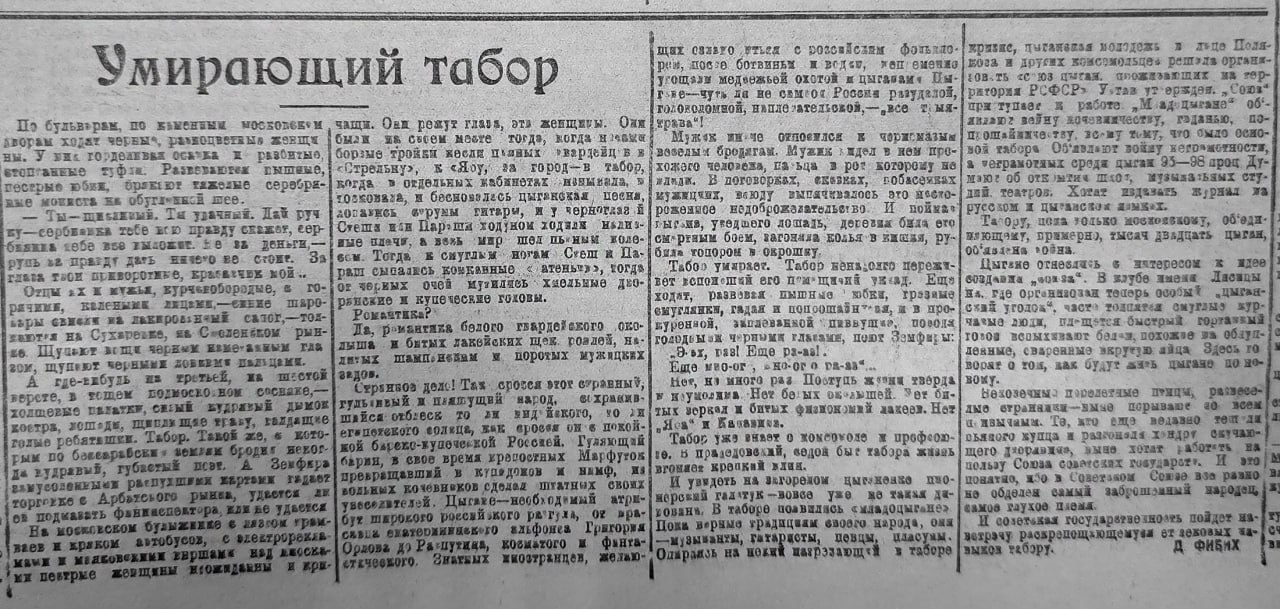 «Умирающий табор» – под таким заголовком в нашей газете вышла статья корреспондента Д.Фибиха о цыганах. Автор изображает типичную сценку, как цыганки гадают молодому человеку: «Ты – счастливый, ты удачливый, дай ручку – вся правду скажем. Не за деньги – рупь за правду дать ничего не стоит. За глаза твои приворотные, красавчик мой...».