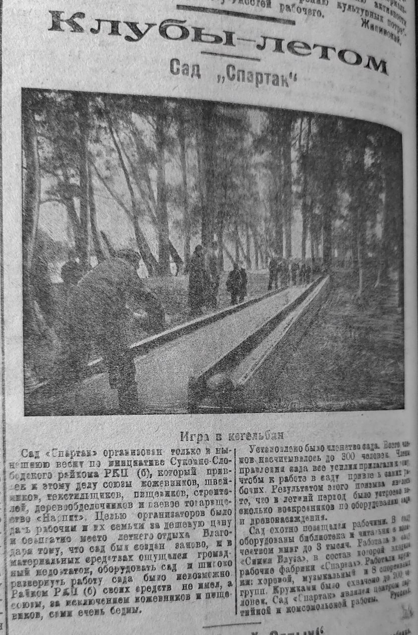 Весной 1925-го года в Казани по инициативе Суконно-Слодобского райкома РКП(б) был создан сад «Спартак» – к организации привлекли союзы кожевников, швейников, текстильщиков, пищевиков, строителей, деревообделочников и паевое товарищество «Нарпит». Однако эти общества были бедными и средств на создание места отдыха не хватало. Было даже создано членство сада, в которое вошло 300 человек. Совместными усилиями организовали воскресники, высаживали деревья в саду. Появилась библиотека с читальней, в которой было до трех тысяч томов. В саду «Спартак» работали хоровой и музыкальной кружки, а также восемь спортивных клуб. На снимке в нашей газете запечатлен кегельбан в зоне отдыха – мужчина бросает шар по дорожке, чтобы попасть в кегли.