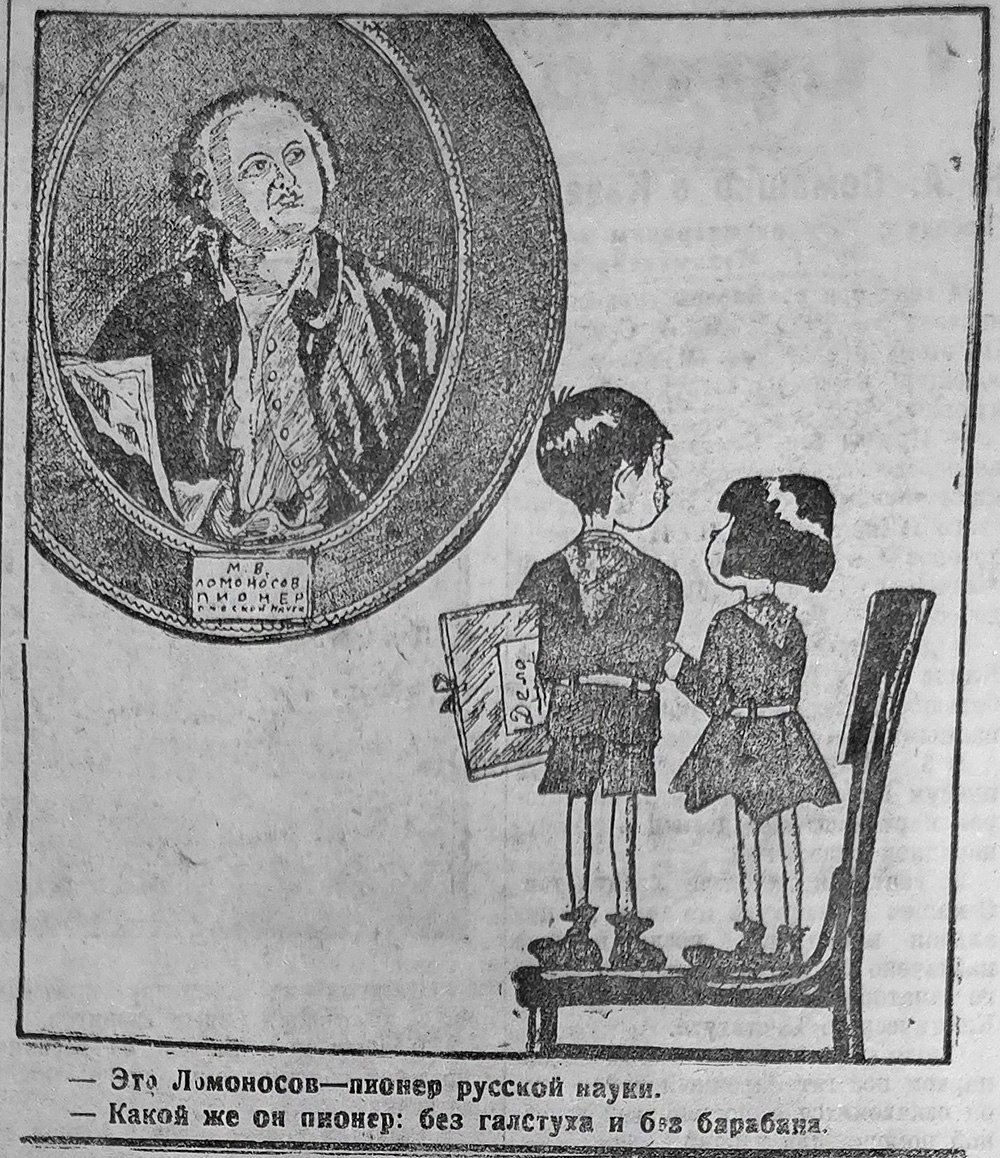 В «Красной Татарии» в уголке юмора печатались карикатуры, а также шарады, шахматные и шашечные задачи и ребусы. На одном из рисунков мальчик и девочка – оба в пионерских галстуках – смотрят на портрет выдающегося русского ученого, академика Михаила Ломоносова. Далее приводится их диалог: «Это Ломоносов – пионер русской науки». – «Какой же он пионер: без галстука и без барабана».