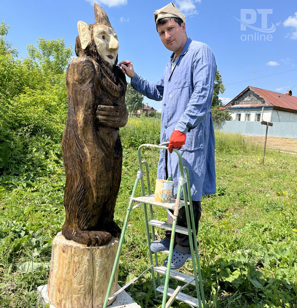 Еще одной отдушиной напоследок стала встреча с Михаилом Гришаевым, скульптором-художником из Зеленодольска. Мы его застали за работой – он наводил марафет на мифологических фигурах, возведенных вдоль тропы Шурале.