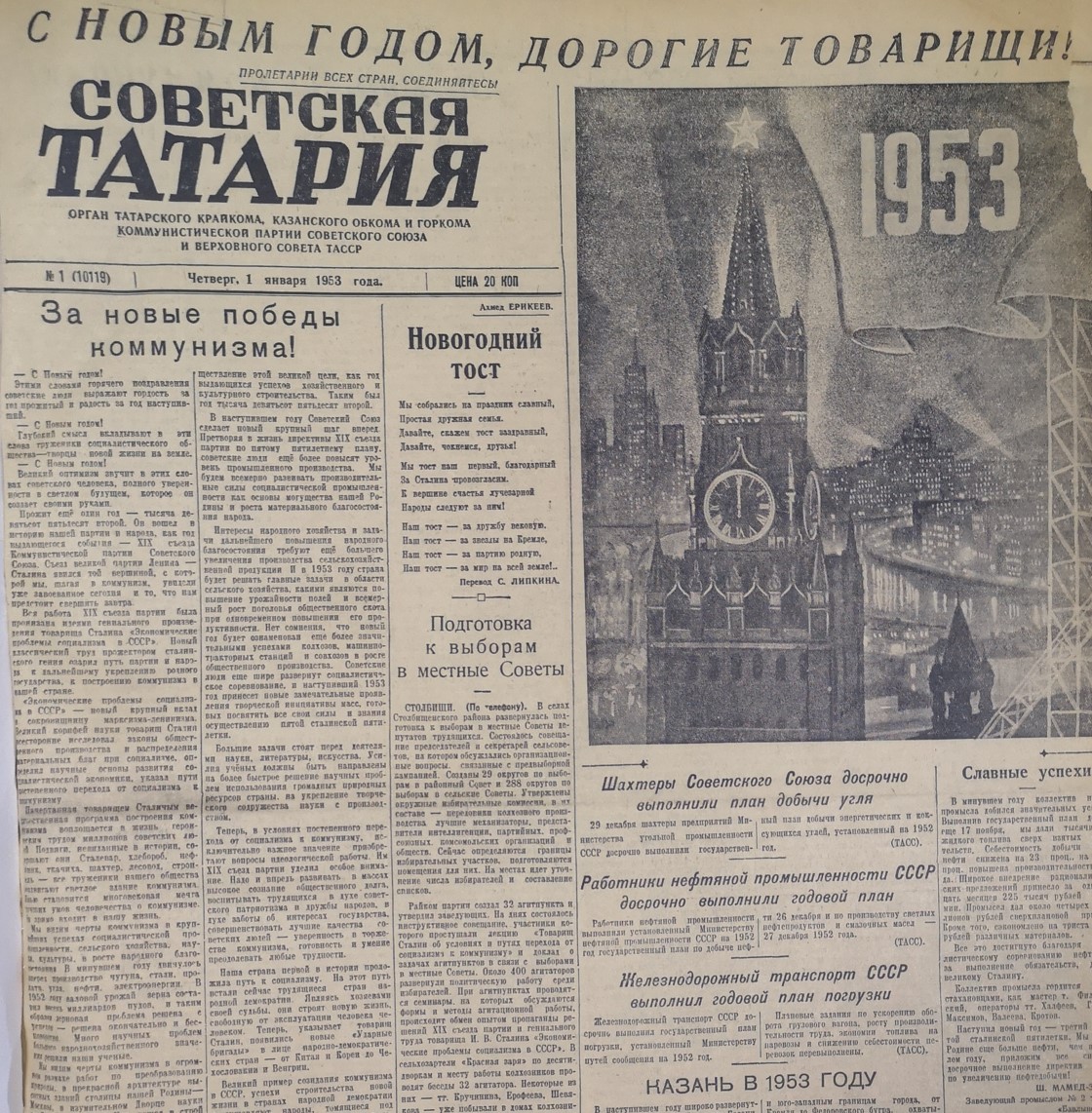 «Наш тост — за дружбу вековую, наш тост — за звезды на Кремле, наш тост — за партию родную, наш тост — за мир на всей земле!» - таким поздравительным стихотворением и изображением Спасской башни Московского кремля открывался номер «Советской Татарии» (так тогда называлась наша газета) за 1 января 1953 года.
