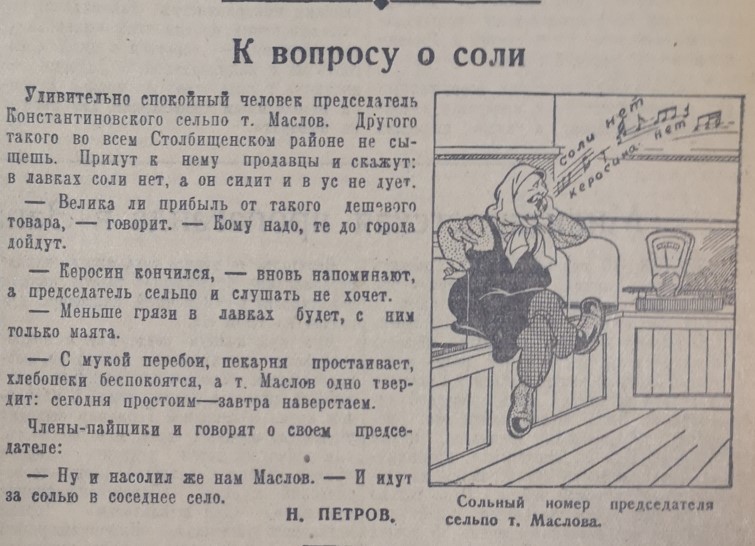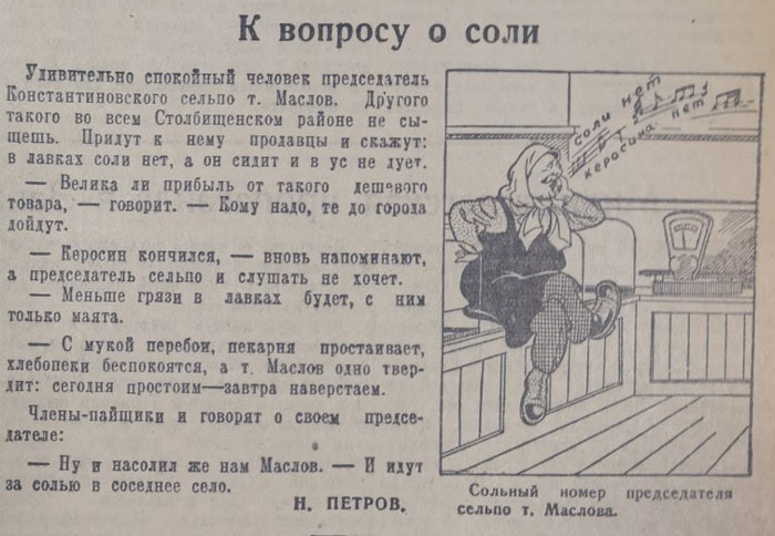 А жители поселка Константиновка Столбищенского района (ныне упразднен) пожаловались, что у них в магазине нет соли, поскольку начальник местного сельпо считает ее слишком дешевым и неприбыльным товаром и завозить отказывается.
