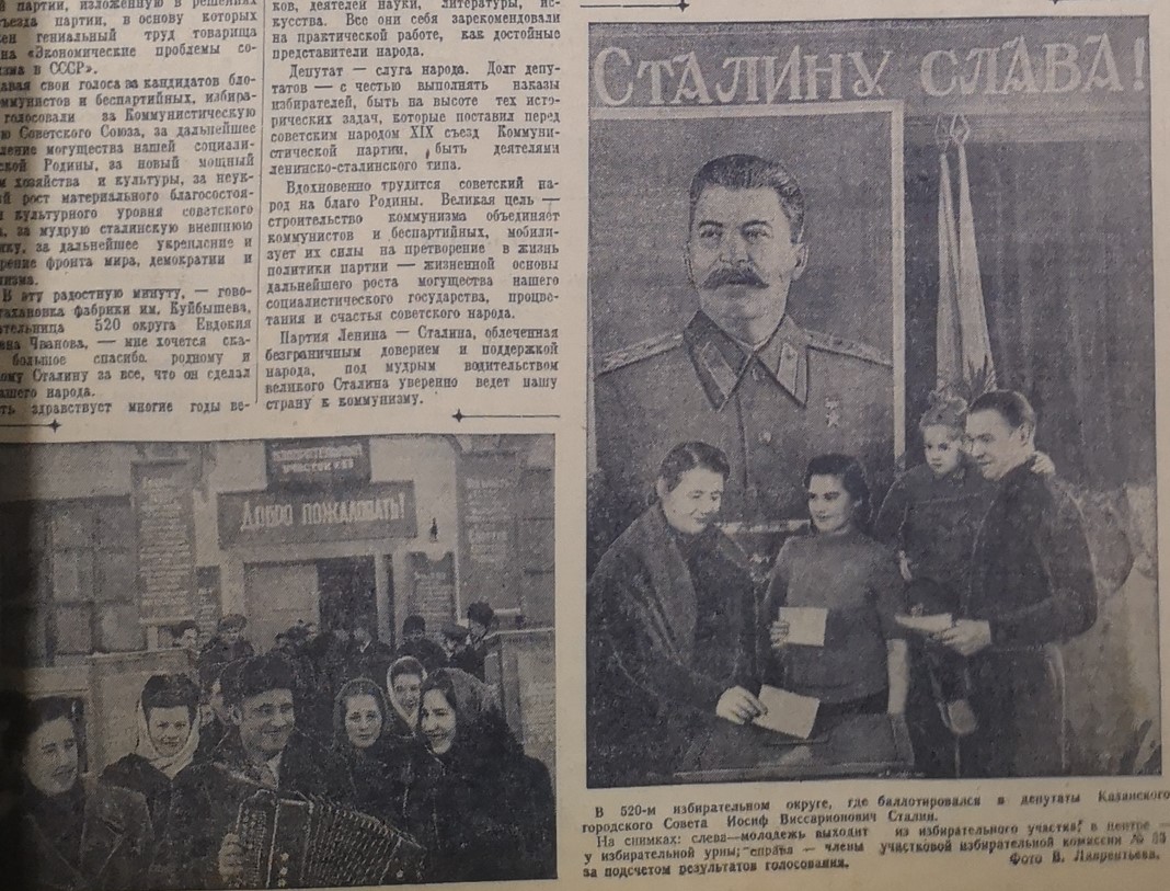 30 января «Советская Татария» сообщила, что Иосиф Виссарионович Сталин дал согласие баллотироваться в депутаты Казанского городского совета депутатов трудящихся по избирательному округу № 520: «Это известие с молниеносной быстротой облетело все фабрики и заводы, учреждения и учебные заведения Казани. Горячей любовью к великому организатору и вдохновителю всех наших побед наполнены сердца советских людей».