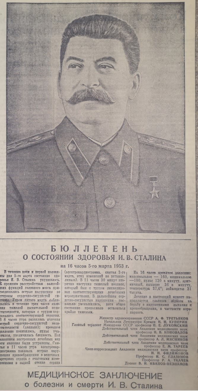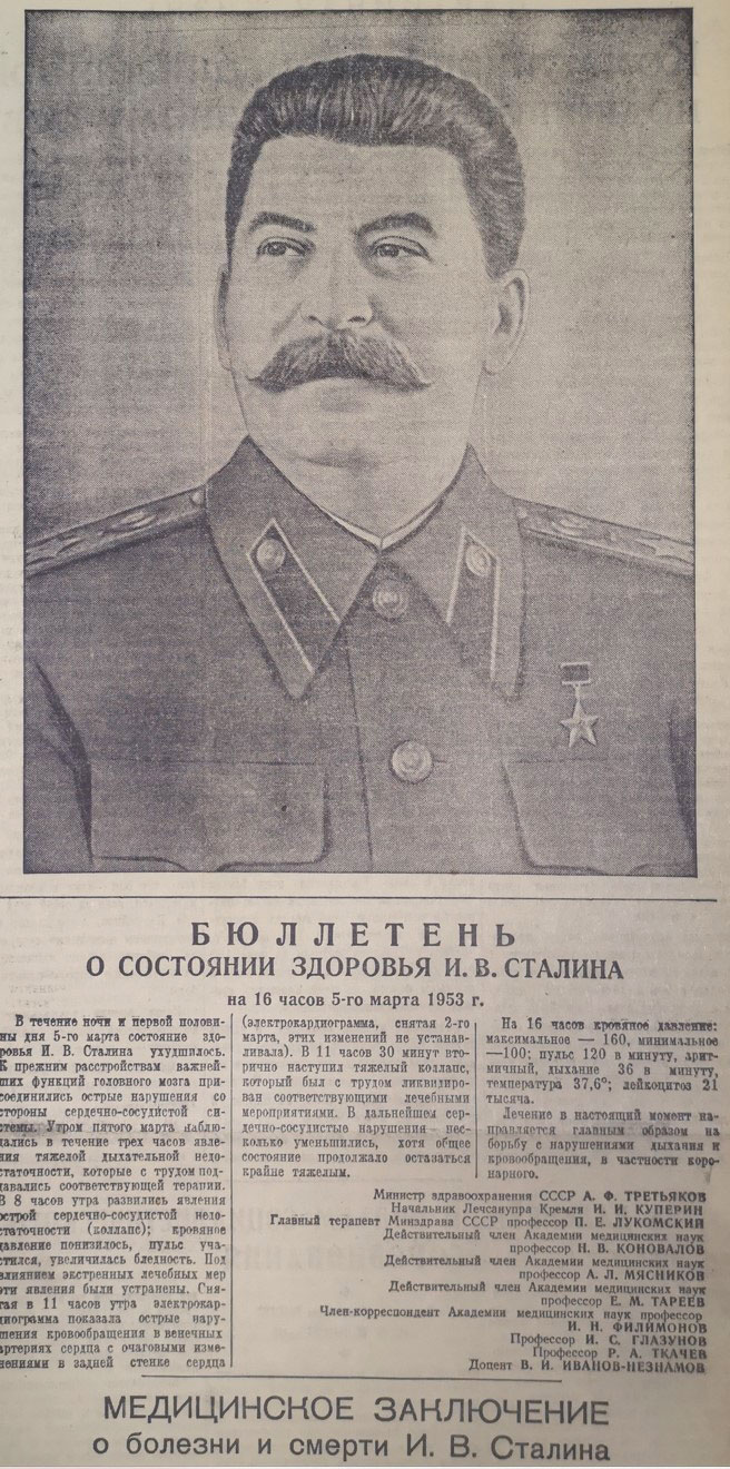 А вскоре грянул гром. Сначала СМИ публиковали бюллетени о состоянии здоровья И.В.Сталина, а 5 марта врачи констатировали, что сердце соратника и гениального продолжателя дела Ленина, мудрого вождя и учителя Коммунистической партии и советского народа Иосифа Виссарионовича Сталина перестало биться.