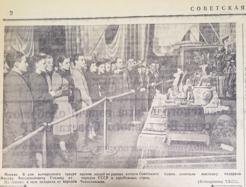 В дни всенародного траура миллионы людей из разных концов нашей страны посетили выставку подарков Сталину от народов СССР и зарубежных друзей.