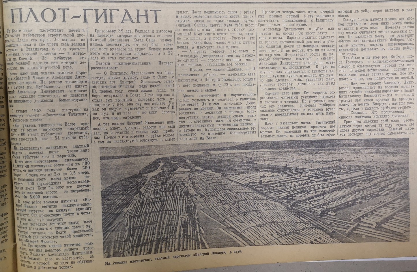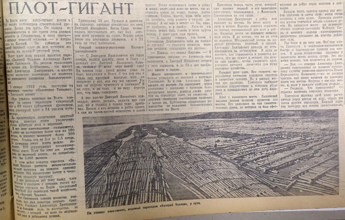 Примечательно, что вел плот наш земляк Александр Григорьев, капитан парохода «Валерий Чкалов», который и до того водил большегрузные плоты. «Мне удалось впервые на Волге провести за одним пароходом спаренный плот в 60 тысяч кубометров древесины, затем строенный плот в 84 тысячи кубометров», - вспоминал он на страницах нашей газеты.