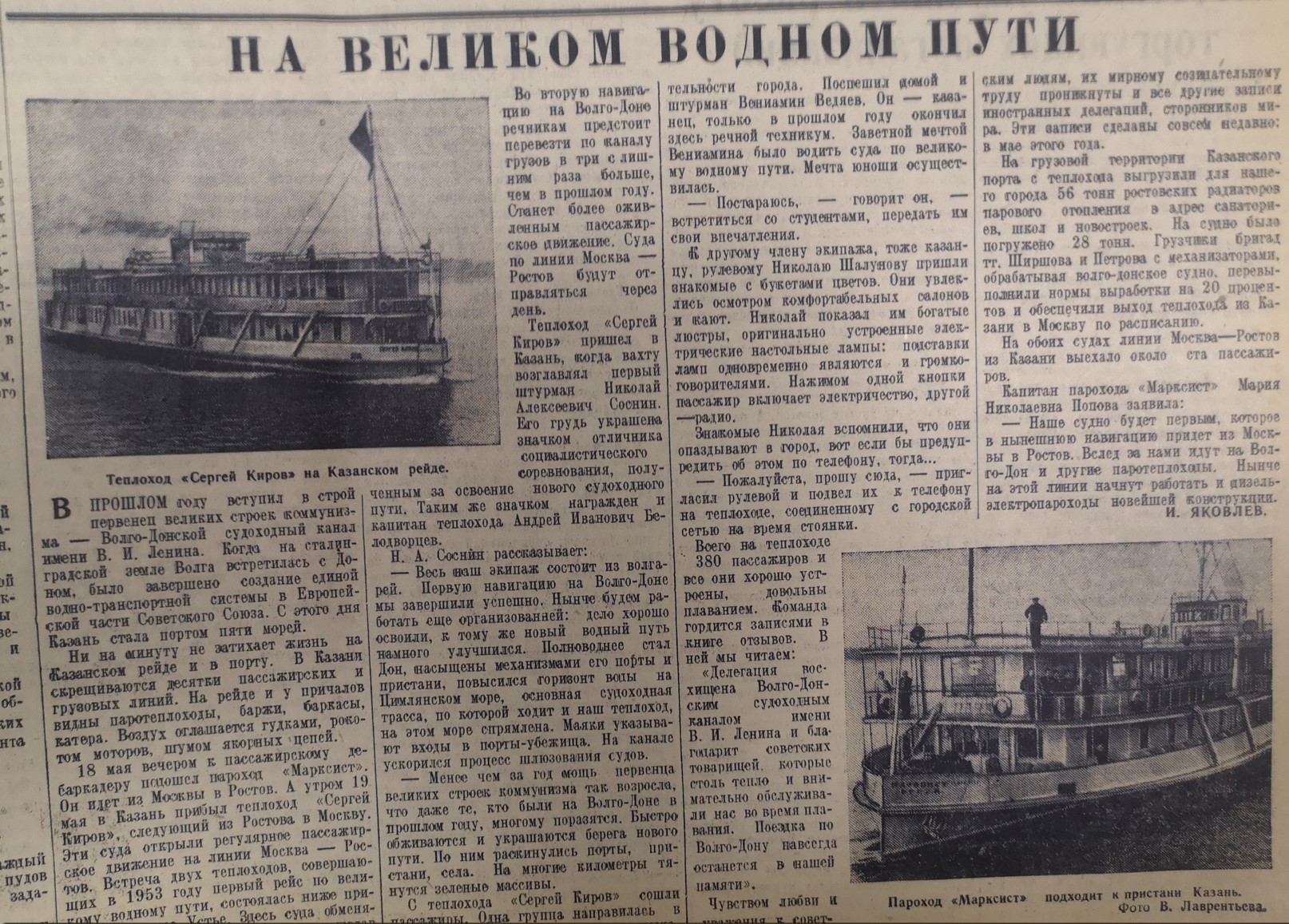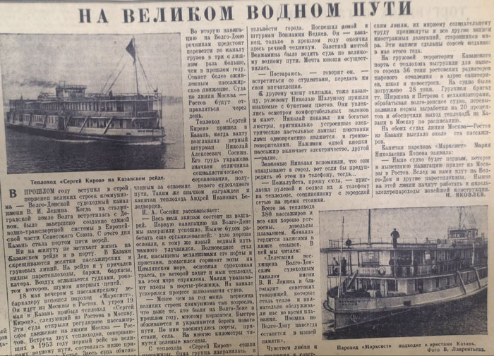 О том, как стахановцы Страны Советов соединили рукотворным каналом Волгу и Дон, мы уже рассказывали в публикации, посвященной 1952-му году. Волго-Донской судоходный канал им. В.И.Ленина — первенец великих строек коммунизма. А 18 мая 1953 года к казанскому пассажирскому дебаркадеру причалил пароход «Марксист», следовавший из Москвы в Ростов. Вместе с теплоходом «Сергей Киров», шедшим из Ростова в столицу (прибыл в Казань 19 мая), эти два судна открыли пассажирское движение на линии Москва — Ростов.