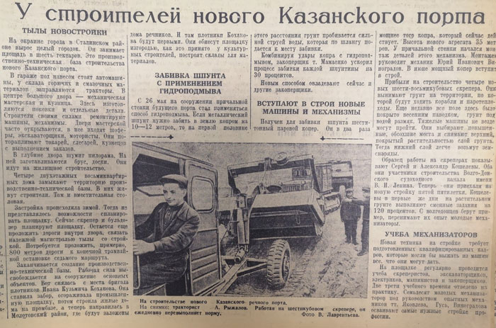 Весь год в нашей газете печаталась хроника строительства Казанского речного порта. Рядом со стройкой в Сталинском районе (ныне Приволжский) вырос целый городок площадью шесть гектаров. Там разместились бытовки строителей, техника, склады горючих и смазочных материалов, кузница. От конечной остановки трамвайного маршрута №7 до городка потребовалось проложить новую дорогу протяженностью около 800 метров, что и было сделано.