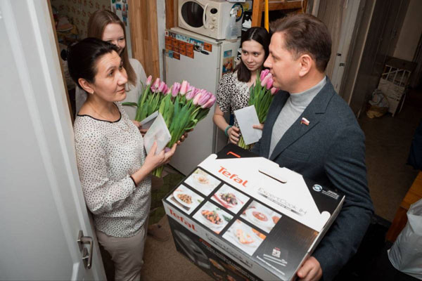 С прошедшим Международным женским днём поздравил семью мобилизованного Ильдара Хазиахметова депутат Госдумы РФ Илья Вольфсон. Он вручил Альфие и её дочерям-двойняшкам Амине и Малике мультиварку, подарочные сертификаты и букеты тюльпанов.