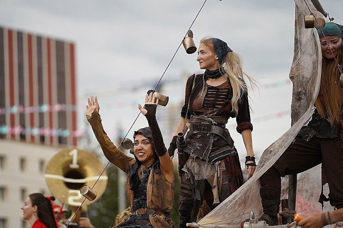 Каждый актер был в своем образе. Причудливые костюмы, грим, ходули, ролики, музыкальные инструменты, шарманка – театральные группы использовали все средства, чтобы впечатлить зрителей, на ходу разыгрывали сценки и с удовольствием фотографировались с желающими. Некоторые подготовили и средства передвижения, в частности гротескный ретроавтомобиль, украшенную зонтиками лодку, свадебную повозку, картонный космический корабль и даже кровать на колесах.