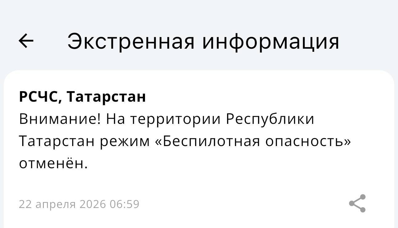 • В Татарстане спустя 4 часа отменен режим беспилотной опасности