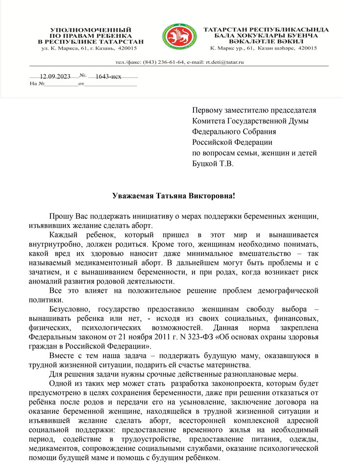 Борьбу с абортами продолжает на всех уровнях Уполномоченный по правам ребенка в РТ и мать четверых детей Ирина Волынец. После ее обращения в республиканский Минздрав и к Раису Татарстана с инициативой запретить частным клиникам делать аборты, треть коммерческих медучреждений, имеющих лицензии на искусственное прерывание беременности, перестали оказывать такую услугу. Правда, депутат Госдумы РФ и экс-министр здравоохранения РТ Айрат Фаррахов предостерегает, что подобные запреты могут привести к тому, что женщины из Татарстана поедут делать аборты в соседние регионы или будут пить таблетки для прерывания беременности самостоятельно. Тем временем Волынец не успокоилась на достигнутом и выдвинула новую инициативу: она призывает государство оказывать всяческую помощь беременным женщинам, которые хотят сделать аборт – лишь бы только они произвели на свет детей.