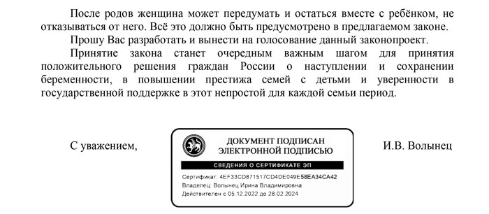 «Одной из таких мер может стать разработка законопроекта, которым будет предусмотрено в целях сохранения беременности, даже при решении женщины отказаться от ребенка после родов и передать его на усыновление, заключение договора на оказание беременной, находящейся в трудной жизненной ситуации и изъявившей желание сделать аборт, всесторонней комплексной адресной социальной поддержки: предоставление временного жилья на необходимый период, содействие в трудоустройстве, предоставление питания, одежды, медикаментов, - говорится в обращении Волынец. - После родов женщина может передумать и остаться вместе с ребенком, не отказываться от него. Все это должно быть предусмотрено в предлагаемом законе. Прошу Вас разработать и вынести на голосование данный законопроект».