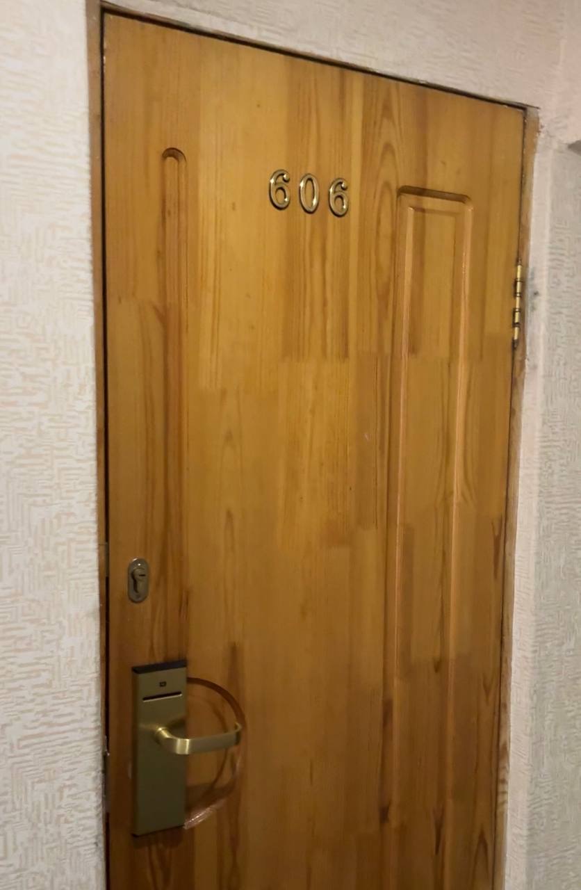 У входа – пост охраны, в холле стоит искусственная елка в золотых игрушках, коричневые диваны с давно протертым на подлокотниках дерматином и стойка администратора, из-за высоты которой не видно, есть там кто-то или нет. Подхожу к стойке и вижу недовольное лицо пожилой женщины, которая устало интересуется, что я от нее хочу. Услышав про бронь, требует паспорт, быстро клацает по клавишам, не реагирует на мою просьбу дать номер с видом на дорогу и в конце концов возвращает мне паспорт вместе с ключом от номера 606.