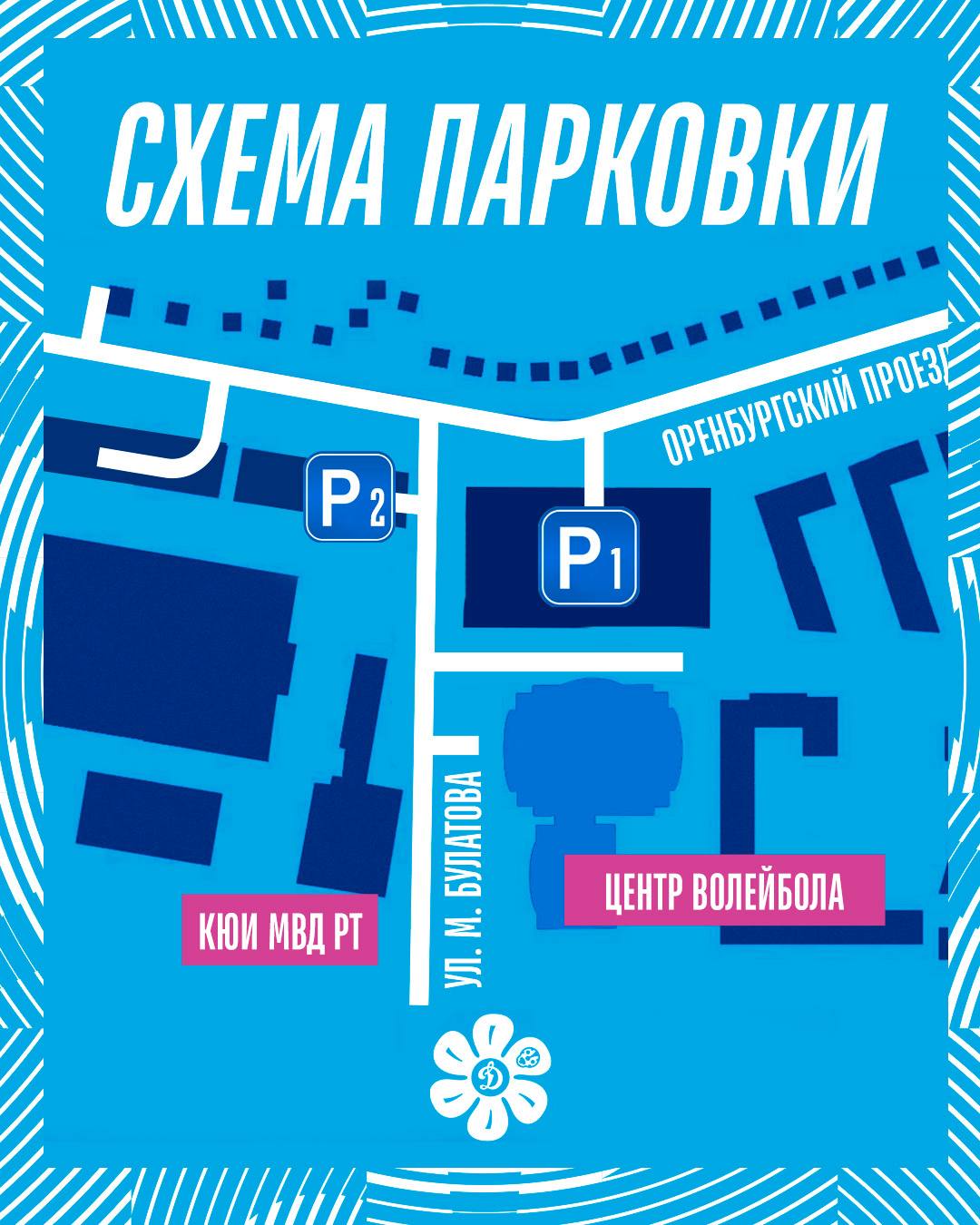 «Сегодня для вас работает бесплатная наземная и многоуровневая парковка (P1 на карте). Владельцы абонементов могут оставить машину и на стоянке КЮИ МВД (Р2)», – сообщает телеграм-канал клуба «Динамо – Ак Барс».
