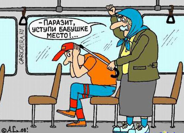 Идёт троллейбус, в котором заняты все сидячие места и кое-где в салоне стоят пассажиры. С задней площадки к старушке, сидящей в левом ряду, подходит молодой человек и, тронув её за плечо, делает красноречивый жест в сторону двери. Бабушка тут же срывается, освобождает место и выходит из троллейбуса. Молодой человек занимает её место. Через небольшую паузу следует всё возрастающая реакция пассажиров: «Вот, паразиты! Мало того, что пожилым место не уступают, так уже и с сидений сгоняют». И поехало…