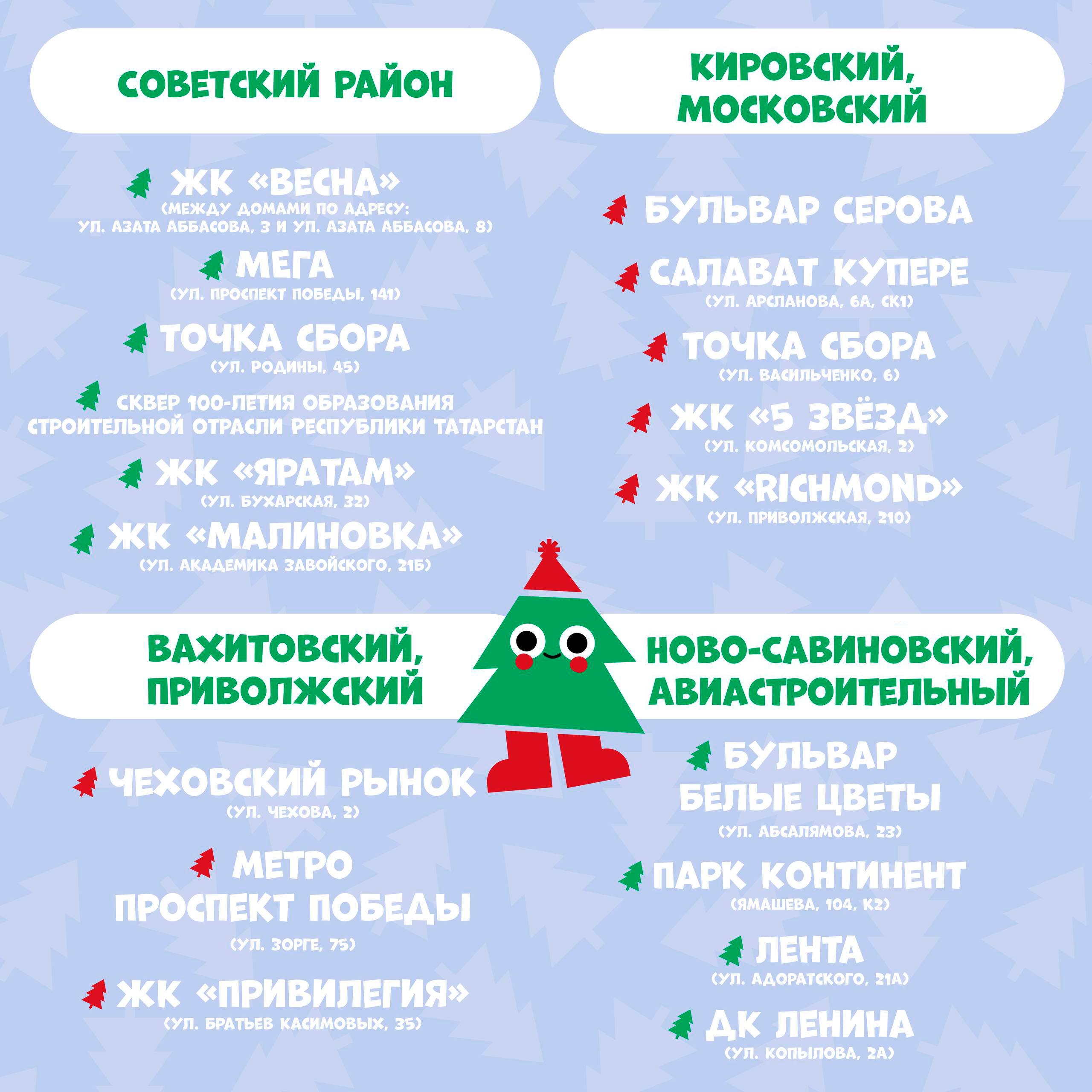 Начавшаяся сегодня в Казани акция «Елки-палки» проходит уже в третий раз и продлится до 31 января. Ее организаторы – проект «Чистые игры – Татарстан», мэрия Казани и регоператор по обращению с отходами – УК «ПЖКХ». В этом году к акции присоединилась и строительная компания СМУ-88: пункты приема появились в ЖК от этого застройщика. Всего в городе открылись 18 пунктов для приема новогодних деревьев (список адресов – ниже). Приносить туда отслужившие свое елки и сосны могут только физлица, от организаций новогодние деревья не примут. Перед тем, как сдать елку в пункт, необходимо снять с нее остатки украшений – дождик, мишуру и пр.