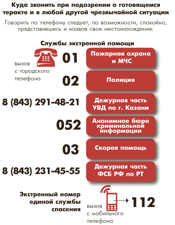МВД по Республике Татарстан напоминает: если вы стали свидетелем преступления, а также если у вас возникли сомнения в законности совершаемых кем-либо действий, обращайтесь в ближайший отдел полиции либо по телефонам 02, 102, 291-20-02. Так вы можете предотвратить общественно опасные последствия и помочь снизить до минимума рост преступности в районе, в котором вы живёте.