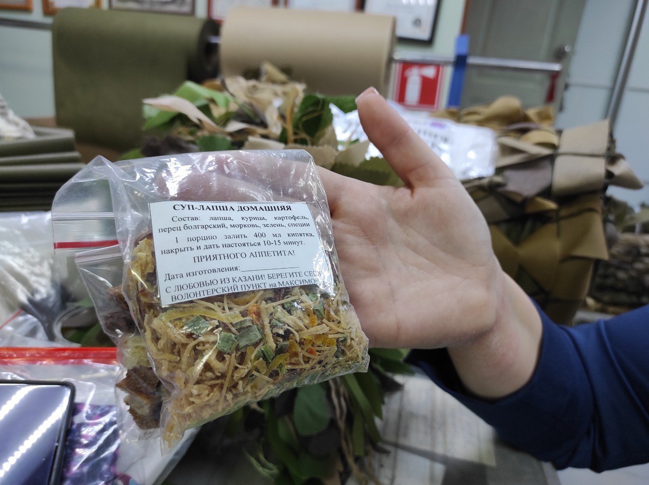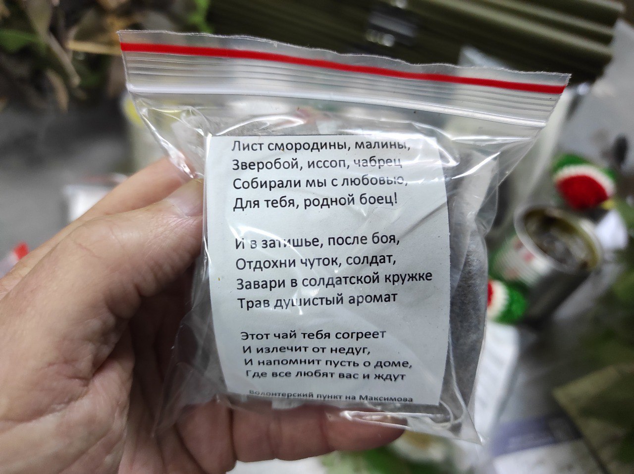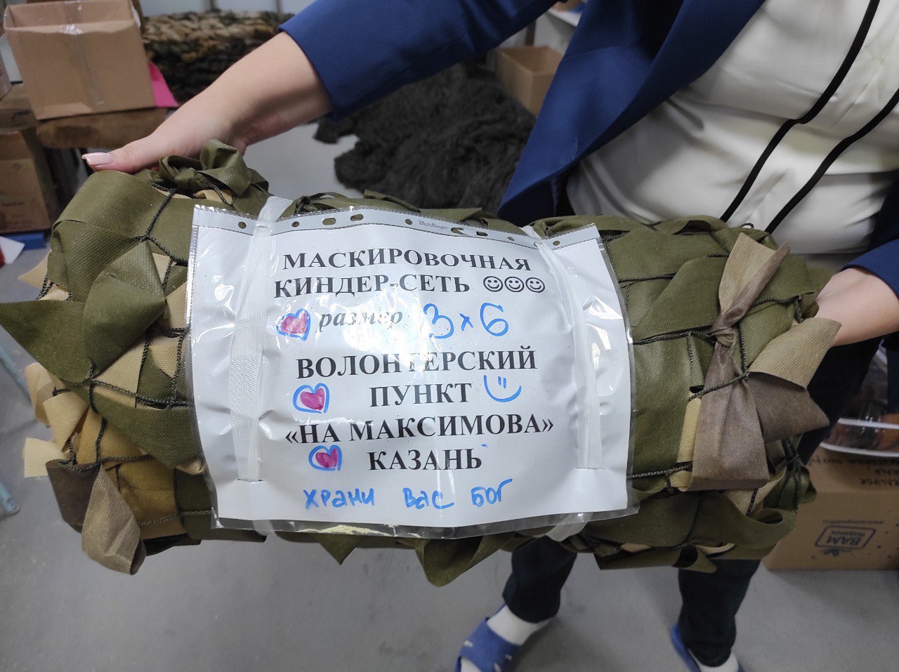 – В каждую сеть, перед тем, как ее плотно свернуть и упаковать, мы кладем свой «киндер-сюрприз». Это подарочный комплект, в нем – упаковка чая, письмо с теплыми пожеланиями бойцу, православные и мусульманские молитвы, а также фирменный талисман нашей волонтерской группы «На Максимова» – связанные вручную сердечки в цветах флагов России и Татарстана.