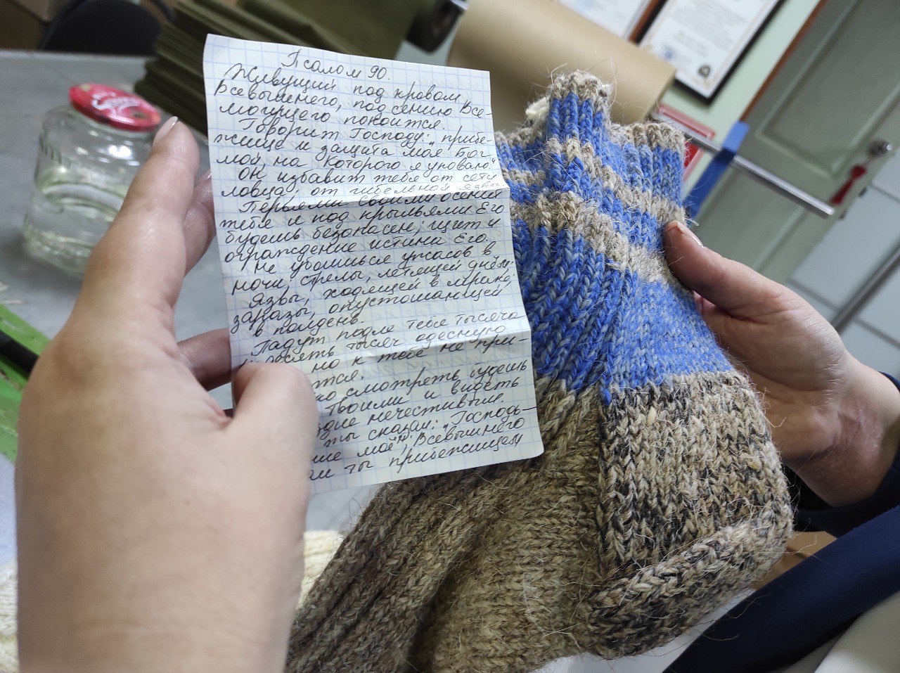 – Конечно! Кроме того, наши бабушки вяжут много шерстяных носков, вот эту партию мы уже приготовили к отгрузке. В каждую пару таких носков мы тоже обязательно вкладываем свои послания, стихи, добрые пожелания, молитвы. А недавно в перечень изделий, которые мы делаем для ребят на СВО, добавился пояс из собачьей шерсти, чтобы поясницу солдатам прикрывать в холода. Собачья шерсть мягкая, она не колется, такие пояса получаются очень теплыми, комфортными и полезными.