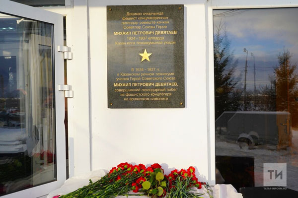 «В 1934–1937 годах в Казанском речном техникуме учился Герой Советского Союза Михаил Петрович Девятаев, совершивший легендарный побег из фашистского концлагеря на вражеском самолёте», – гласит надпись на новой мемориальной доске, установленной в столице Татарстана.