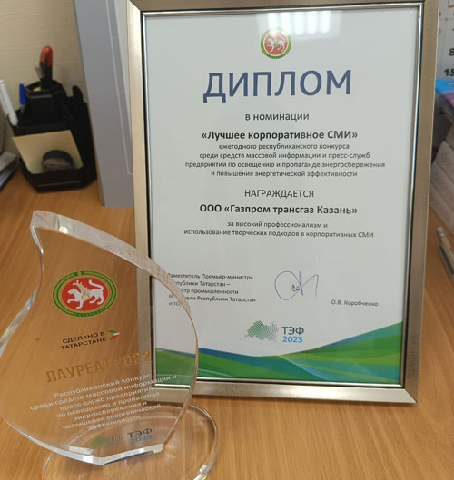 На заседании Правительства РТ, которое прошло в МВЦ «Казань Экспо» в рамках трёхдневного Татарстанского международного форума по энергетике и энергоресурсоэффективности, состоялось награждение победителей Республиканского конкурса среди средств массовой информации и пресс-служб предприятий по освещению и пропаганде энергосбережения и повышения энергетической эффективности. В номинации «Лучшее корпоративное СМИ» победу одержало ООО «Газпром трансгаз Казань» за газету «Жизнь газовиков». Награду за высокий профессионализм и использование творческих подходов генеральному директору компании Рустему Усманову вручил вице-премьер – министр промышленности и торговли Олег Коробченко. «Жизнь газовиков» выпускается на базе газеты «Республика Татарстан» ежемесячно с января 2005 года.