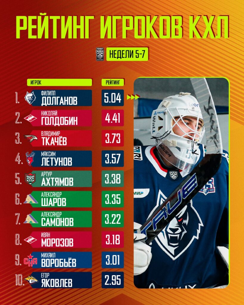 Никому из конкурентов даже близко не удалось подобраться к стражу ворот «Нефтехимика». У идущего на втором месте нападающего Николая Голдобина из московского «Спартака» рейтинг только 4,41, а у форварда омского «Авангарда» Владимира Ткачёва, занимающего третье место, - 3,73.
