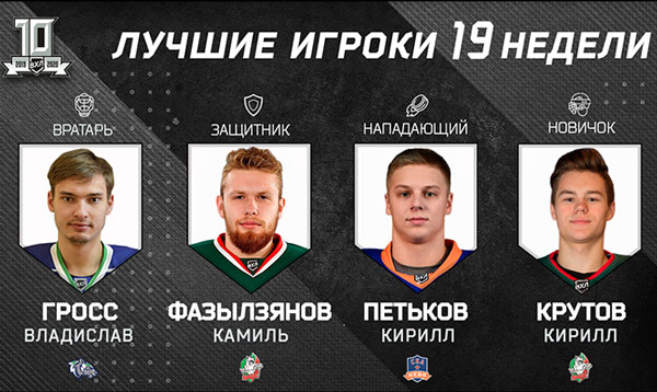 Лучшими игроками 19-й недели в ВХЛ стали два представителя «Барса». Камиль Фазылзянов, в активе которого 4 очка в двух матчах, признан лучшим защитником. В номинации «Лучший новичок», где могут участвовать игроки в возрасте не старше 25 лет и отыгравшие в лиге в предыдущих сезонах не более 20 матчей, победу одержал нападающий Кирилл Крутов, набравший в двух матчах 3 очка.