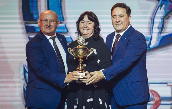 Кубок за победу в комплексном зачёте Елена Вяльбе вручила главе федерации Ильшату Фардиеву (справа) и главному тренеру сборной РТ Эдуарду Галееву.