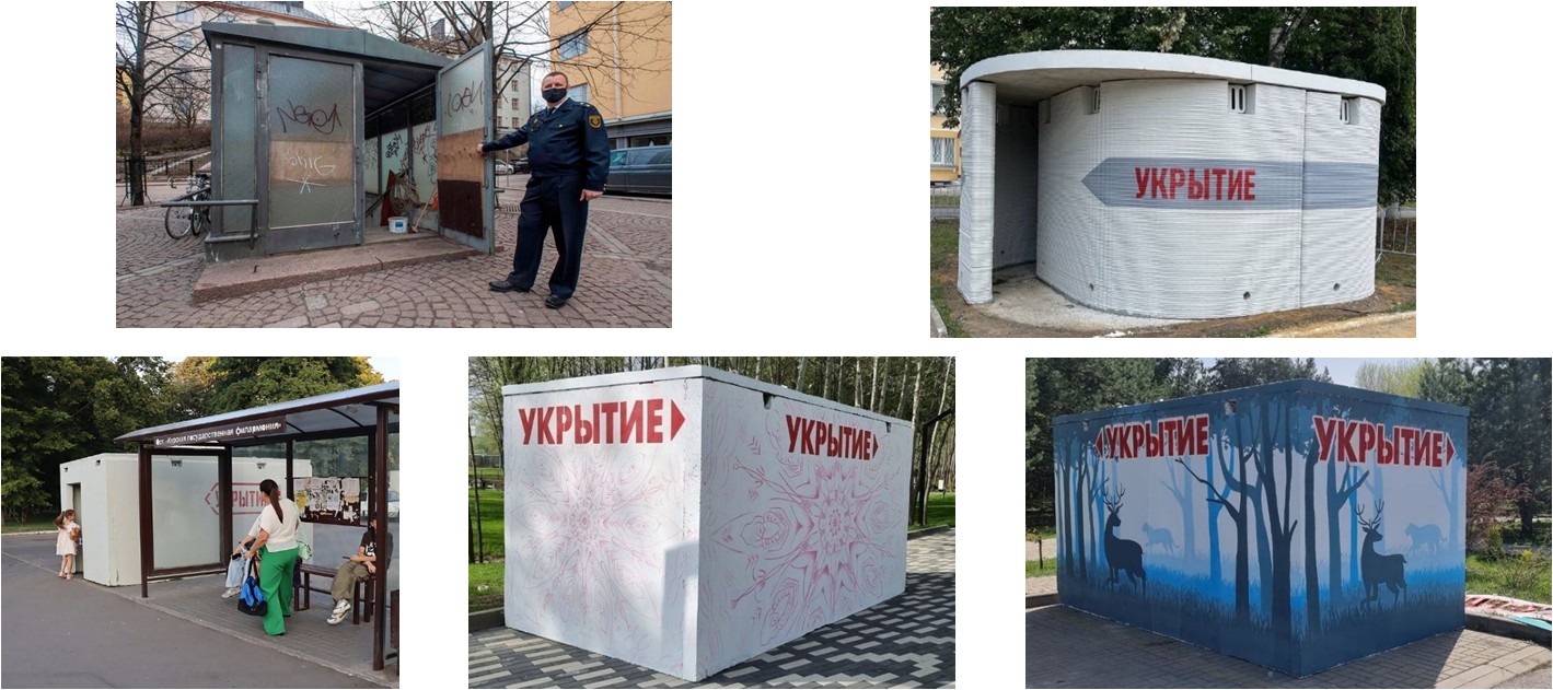 Наземные укрытия, выполненные из бетонных блоков, внешне напоминают обычные остановочные павильоны. Их вместимость – 15 человек, имеются вход и выход, которые при наличии угрозы открываются автоматически. Укрытие подземного типа вмещает от 100 человек. Принцип расположения таких защитных сооружений – шаговая доступность. Если человек, находясь на улице, получает на телефон сообщение о воздушной угрозе и необходимости пройти в укрытие, он должен быстро обнаружить это укрытие.