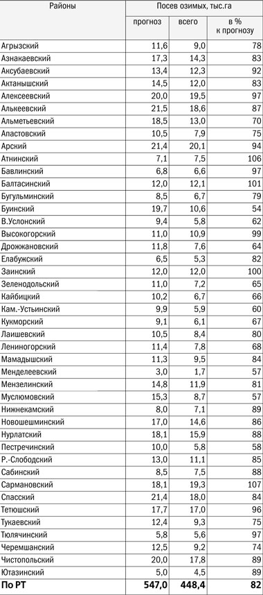 Общий намолот зерна составляет 4 миллиона 202 тыс. тонн при урожайности в среднем 34,7 центнера с гектара (27,4 на аналогичную дату прошлого года). Около 47 центнеров с гектара собирают в Заинском и Нурлатском районах.