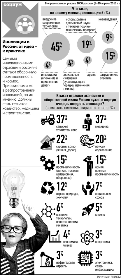 Самыми инновационными отраслями россияне считают оборонную промышленность и космос. Приоритетами же в распространении инноваций, по их мнению, должны стать сельское хозяйство, медицина и строительство.