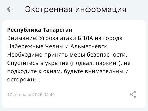 О том, что означают сообщения МЧС о «Беспилотной опасности» и «Угрозе атаки БПЛА» «РТ» подробно писала ранее. Читайте в материале Воздушная угроза: жителям Татарстана объяснили, как реагировать на СМС о беспилотниках.