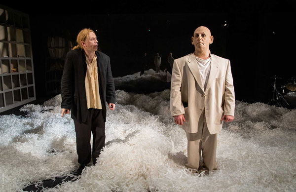 В спектакле они даже внешне принадлежат к разным весовым категориям. Цензор похож на борца сумо, которого лишь суровая необходимость заставила облачиться в белый костюм – столь же бесформенный, как и скрытая под ним избыточная плоть. Драматург же – типичный свободный художник: худой, нервный… И если бы не природная харизматичность Эмиля Талипова, которую он мужественно прячет за длинными сальными волосами и бесцветными интонациями, то эти двое смотрелись бы как идеальный комик-дуэт, где один понарошку бьёт, а второй размазывает по лицу клюквенный сок, один убегает – второй догоняет и так далее по одному и тому же кругу. Чёрная комедия, клоунада, одним словом. И до определённого момента так оно и воспринимается, но потом спектакль начинает явно дрейфовать в сторону драмы.