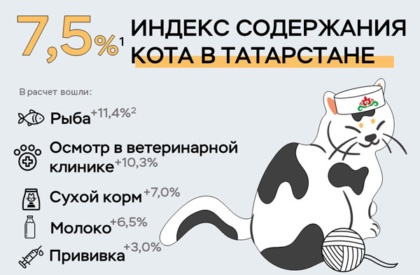 С ростом популярности домашних питомцев становятся всё более востребованными услуги ветеринаров. Осмотр в клинике для животных за год подорожал на 10,3%. На рост цен повлияло увеличение затрат на оплату труда специалистов, коммунальные услуги, расходные материалы (из-за нарушения логистических цепочек) и оборудование (из-за роста мировых цен на металл). Сделать необходимую прививку коту в октябре 2021 года в Татарстане стоило на 3% дороже, чем годом ранее. Основная доля затрат приходится на вакцины, стоимость которых увеличивается из-за роста цен на доставку и сырьё для производства медицинских изделий. Динамику цен на прививки сдерживает большой выбор препаратов для животных. К тому же в республике вакцинация от бешенства препаратами отечественного производства осуществляется бесплатно.