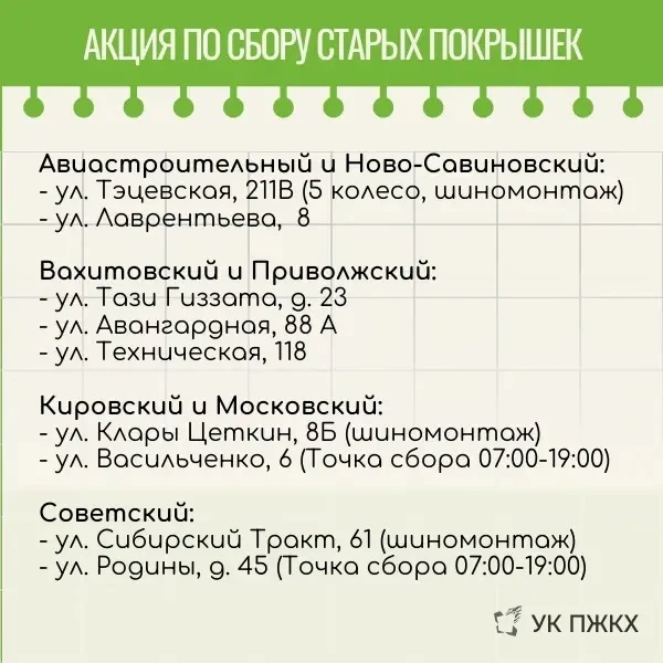 Жители Казани смогут с 6 по 20 апреля сдать автомобильные покрышки на переработку. Специальные оранжевые бункеры будут расположены во всех районах города, сообщает УК ПЖКХ.