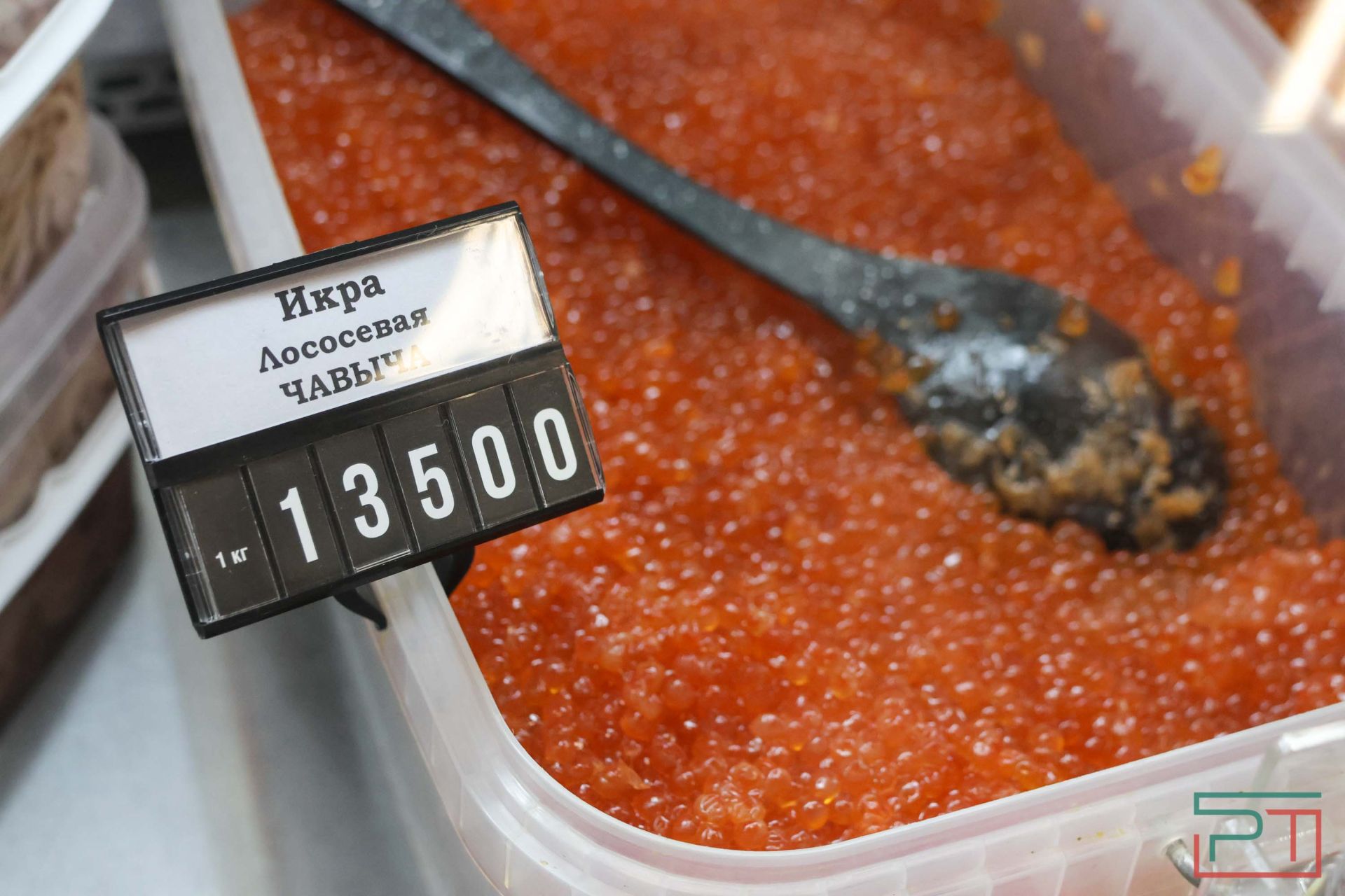 Самым «люксовым» островком стал рыбный павильон. Здесь — деликатесы с Камчатки: чавыча по 5900 руб./кг, тунец — 3900, белуга — 5200. Рядом — рулеты из тунца и эсколара, клешни краба, а венчала витрину королева всех продуктов — лососевая икра по 13 500 рублей за килограмм.