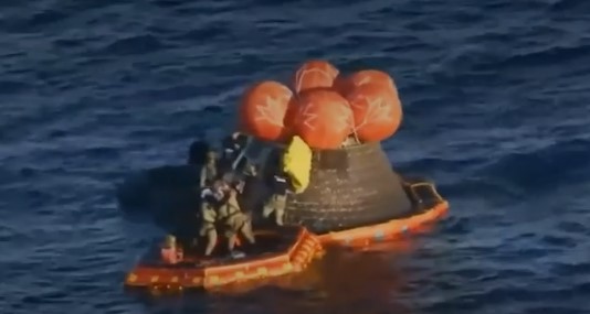 Корабль приводнился в Тихом океане недалеко от побережья штата Калифорния. Астронавты покинули корабль и пересели в надувной плот. В этом им помогли военные. Экипаж должны на вертолетах доставить на борт корабля ВМС США USS John P. Murtha.