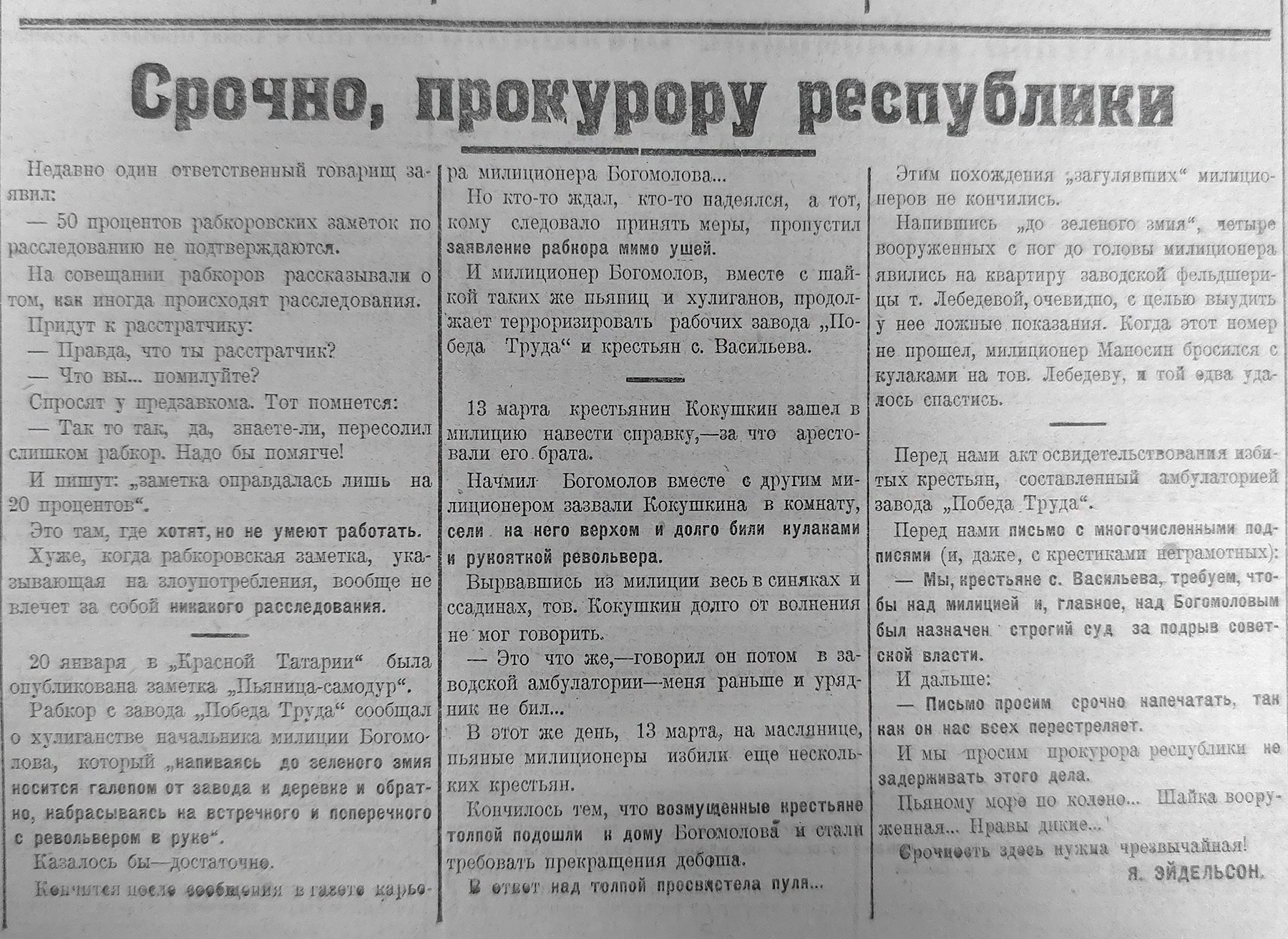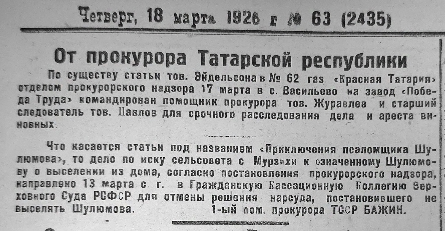 Заметка под заголовком «Срочно, прокурору республики» также вышла в нашей газете в марте. В ней журналист возмущается тем, что сообщение рабкора «Красной Татарии» с завода «Победа Труда» в селе Васильево о пьяных дебошах тамошнего начальника милиции Богомолова, «который, напиваясь до зеленого змия, носится галопом от завода к деревне и обратно, набрасываясь на встречного и поперечного с револьвером», осталось без должного внимания, хотя оно вышло в газете еще в январе. В итоге милиционер-самодур распоясался еще больше и продолжает терроризировать рабочих и крестьян.