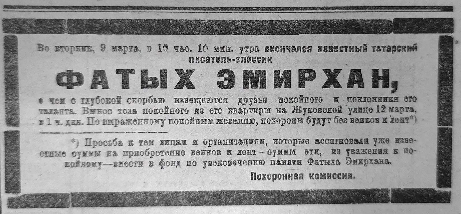 9 марта 1926 года скончался известный татарский писатель и публицист Фатих Амирхан. Похоронная комиссия сообщала в нашей газете, что вынос тела покойного из его квартиры в доме на улице Жуковского состоится 12 марта в час дня.
