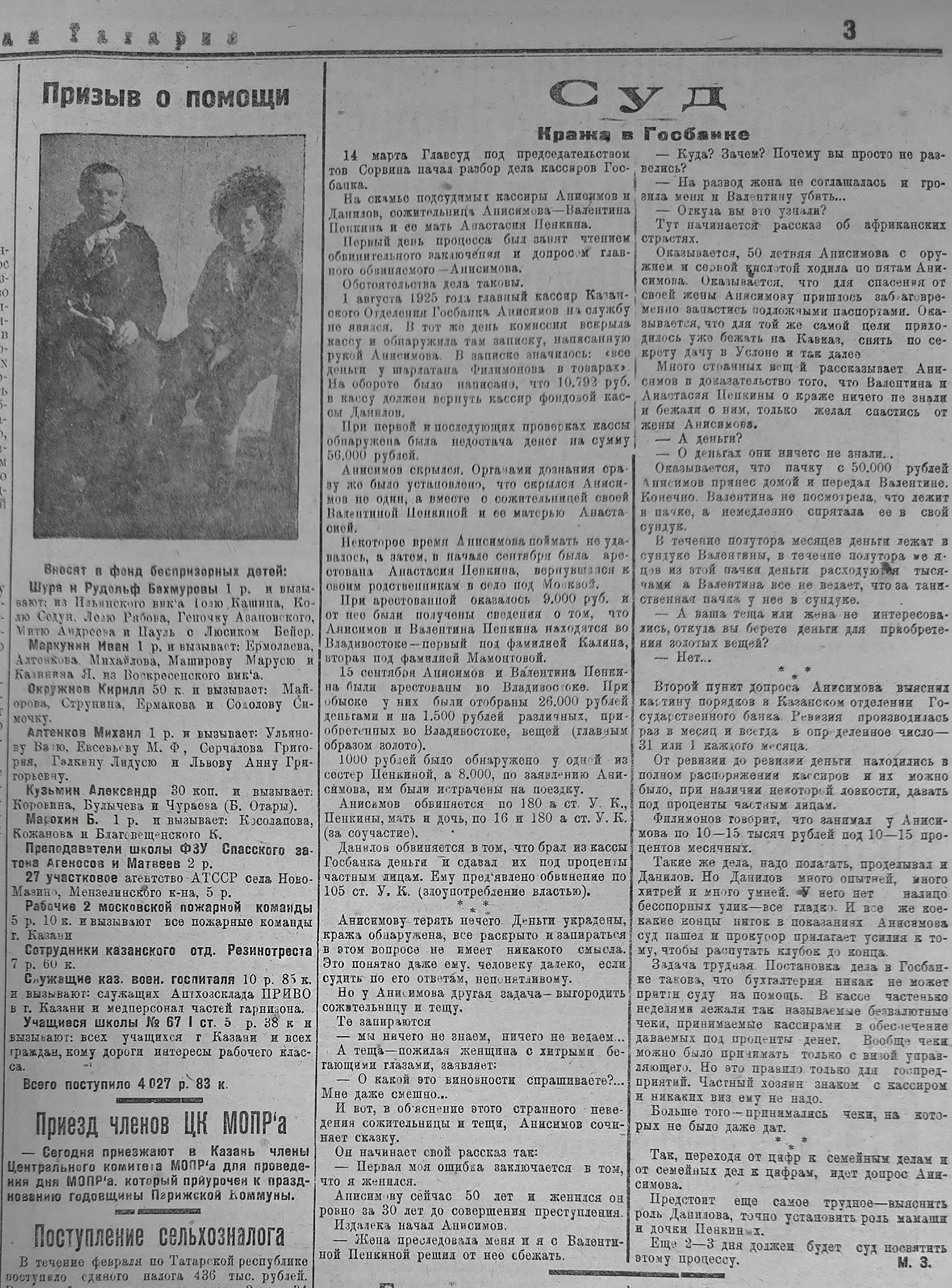 Громкое дело главного кассира Казанского отделения Госбанка Анисимова, обвиняемого в хищении государственных средств, начали рассматривать в суде 14 марта. Криминальная история оказалась замешена на любви. 1 августа 1925 года 50-летний Анисимов не явился на службу, в тот же день в банке обнаружилась крупная недостача – 56 тысяч рублей. Следователи выяснили, что кассир скрылся не один, а вместе со своей сожительницей и ее матерью. Последнюю с фальшивым паспортом на другое имя задержали под Москвой, при обыске у нее нашли 9 тысяч рублей. Женщина призналась следователям, что парочка прячется во Владивостоке. Там беглецов и арестовали, у них нашли 26 тысяч рублей и еще купленные во Владивостоке золото и товары на 1500 рублей. Все трое оказались на скамье подсудимых.