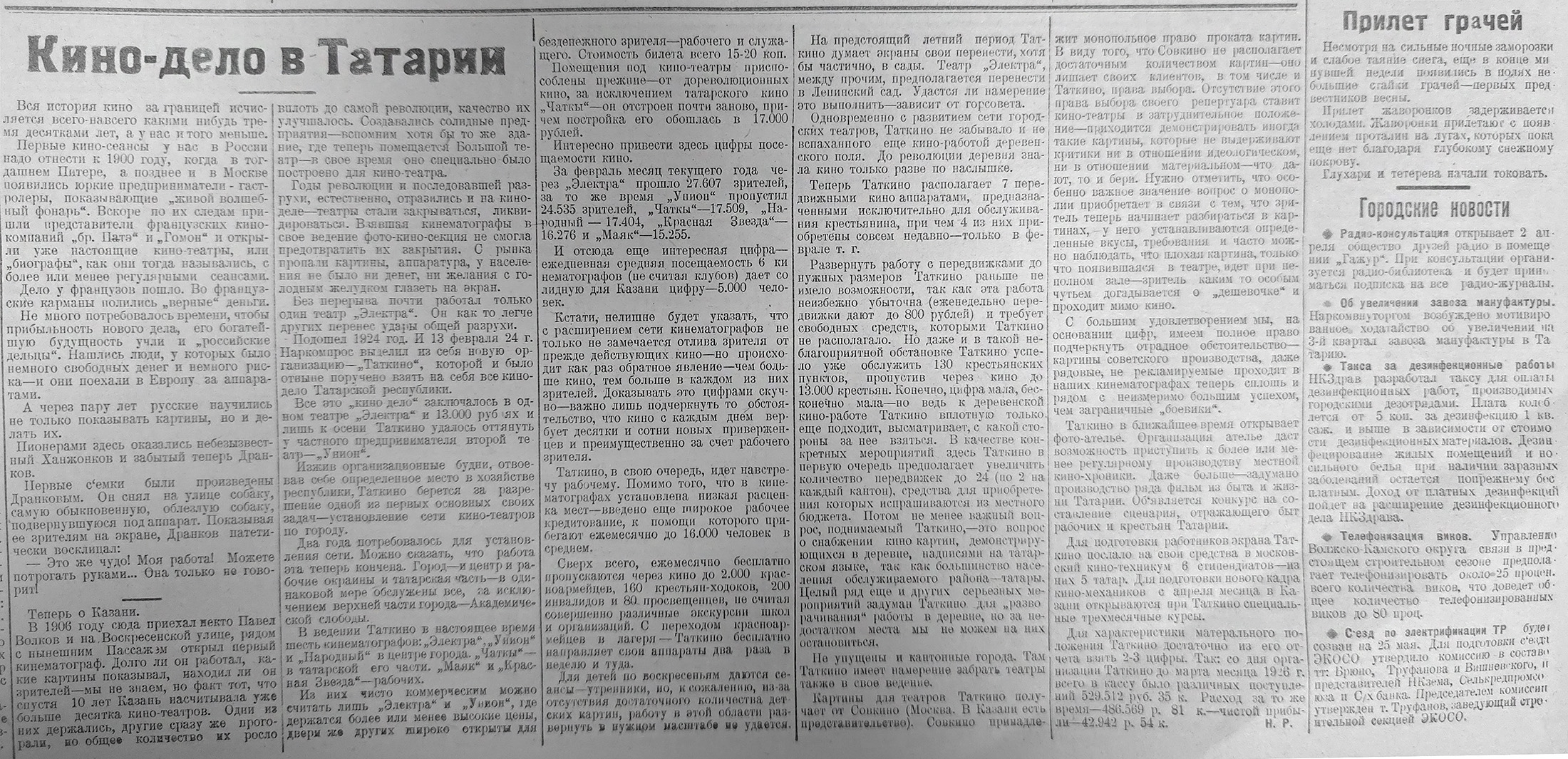 Созданная в феврале 1924 года организация «Таткино» взялась возрождать кинодело в Татарской республике. За два года в Казани появилась сеть кинотеатров: в центре города работали «Электра», «Унион» и «Народный», в Татарской слободе – «Чаткы», в рабочих районах – «Маяк» и «Красная Звезда».